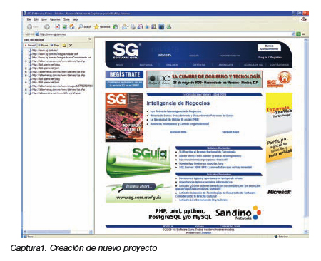 Una vez creado el proyecto, debes agregar el web test. Para agregar el web test puedes oprimir el ícono de New Test o seleccionar New Test desde el menú de Test. Los diferentes tipos de prueba aparecen en el dialogo de Add New Test. Los tipos de pruebas que existen incluye: Generic, Web, Load, Manual, Ordered, y Unit. Selecciona Web Test y captura el nombre para la prueba y el proyecto que vas a comenzar. Una vez que hayas presionado OK aparecerá una sesión en blanco de Internet Explorer lista para iniciar la grabación de actividad del navegador. Los controles de grabación te permiten comenzar, detener, parar, comentar o borrar la grabación. Estoy utilizando www.sg.com.mx como dirección para este ejemplo. Nótese que en cuanto comienza la actividad http se empieza a grabar. Esto se puede ver en el árbol jerárquico de las requisiciones http que aparece bajo los controles de grabación.