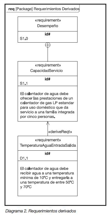 Tras una breve investigación descubriremos que un calentador de gas LP estándar recibe agua a una temperatura de 10°C y la entrega a una temperatura que oscila entre los 50°C y 70°C. La dependencia derivada es la relación que se puede observar entre los requisitos S1.1 (que surge al seguir descomponiendo el requerimiento S1.0) y D1.1. Si bien el requerimiento D1.1 no forma parte de los requerimientos originales, se puede derivar a partir de ellos.