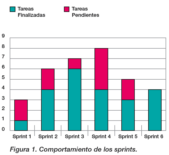 Como se aprecia en la figura 1, durante los primeros tres Sprints el nivel de productivi-dad se fue incrementando de manera pro-gresiva. Es evidente que conforme el equi-po fue asimilando el proceso de Scrum, un mayor porcentaje de las tareas se completó. Es importante hacer notar que el éxito de cada Sprint se fundamenta en el análisis cui-dadoso de cada una de las funcionalidades seleccionadas del Product Backlog. Si se descuida este factor de éxito, sería muy fácil sobrepasar la capacidad de trabajo del equi-po, dando como resultado la incapacidad de cumplir con el compromiso de finalizar 100% de las tareas. Como en todo proceso de aprendizaje, es a través de la prueba y el error, que el equipo adquiere la maestría necesaria para lograr un equilibrio entre la capacidad del equipo y la carga de trabajo. Se puede notar que a partir del cuarto Sprint hay una caída drástica de 35.71% en el nivel de productividad. Las causas se analizarán a detalle más adelante en la figura 3.