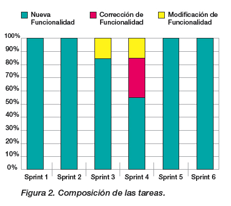 En la figura 2 se puede observar que durante los Sprints uno, dos, cinco y seis, el Sprint Backlog se compuso exclusivamente de tareas orientadas a generar nueva funcionalidad. Es decir, en estos ciclos no se trabajó en resolver bugs, ni en agregar o modificar funcionalidad a aplicaciones ya existentes. En el tercer Sprint, 14.29% de las tareas que se trabajaron, estuvieron orientadas a modificar funcionalidades de aplicaciones ya liberadas anteriormente.