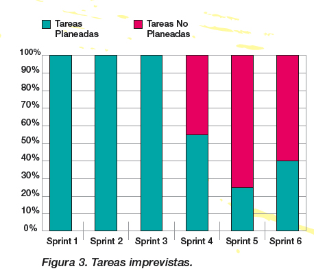 b) El usuario final una vez que tuvo la funcionalidad requerida, se da cuenta que ésta no satisface sus necesidades. En la figura 1 ya vimos que en el Sprint 4 hubo una caída notable de productividad en cuanto a tareas finalizadas. En la figura 3 se aprecia que a partir de este Sprint el equipo se vio en la necesidad de aceptar tareas que originalmente no habían formado parte del Sprint Backlog, lo cual provocó la baja en productividad.