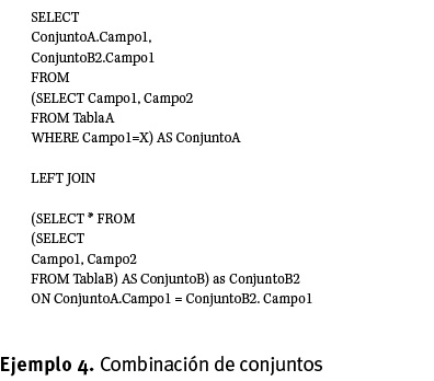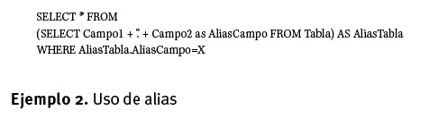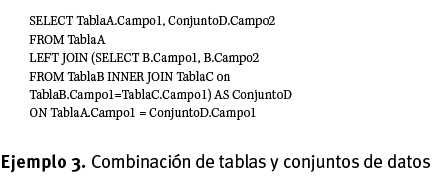 En este contexto, nos referimos a un conjunto de datos como una consulta de una o varias tablas a la que se puede acceder como si fuera una sola entidad. Podemos crear un conjunto de datos en SQL y bautizarlo con un alias para poder referirnos a él. El ejemplo 2 muestra como obtener un conjunto de datos y asignarle un alias.