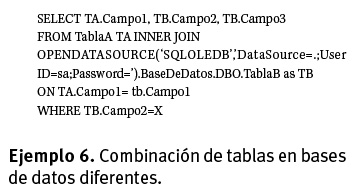 El ejemplo 6 muestra como hacer un join desde una base de datos en SQL Server hacia una base de datos externa utilizando la instrucción OPENDATASOURCE. Notarán que estamos enviando el user/password como parte del string de conexión, lo cual no es una buena práctica, pero para los fines