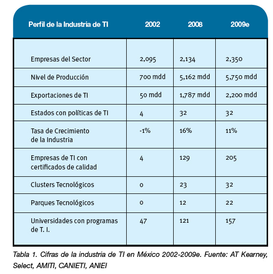 Desde el 2002 en que se creó el Prosoft para el impulso de la industria de software, hasta el 2008 se han puesto en marcha proyectos del orden de los 10 mil millones de pesos con una inversión conjunta del Gobierno Federal, Gobiernos Estatales e Iniciativa Privada. De esta forma, las empresas del Sector de Tecnologías de Información han logrado llevar su producción de los 700 millones de dólares en el 2002, a 5,750 millones de dólares estimados para el 2009. La tabla 1 muestra mayor información al respecto.
