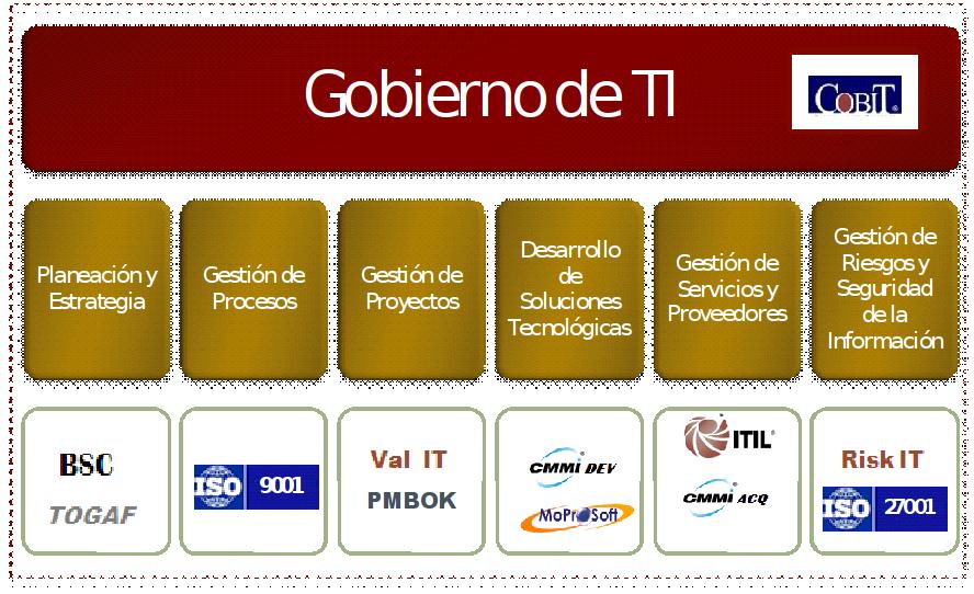Figura 1. Principales marcos de referencia utilizados por MAAGTIC.El Marco rector de procesos proporciona una guía descriptiva de las actividades, roles y productos de los procesos críticos para la dirección, control, gestión y operación de una UTIC; así como un esquema de indicadores que permitirá medir los resultados, efectividad y eficiencia de los procesos.