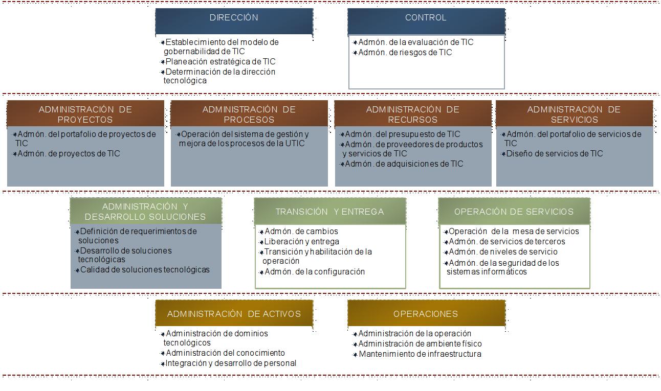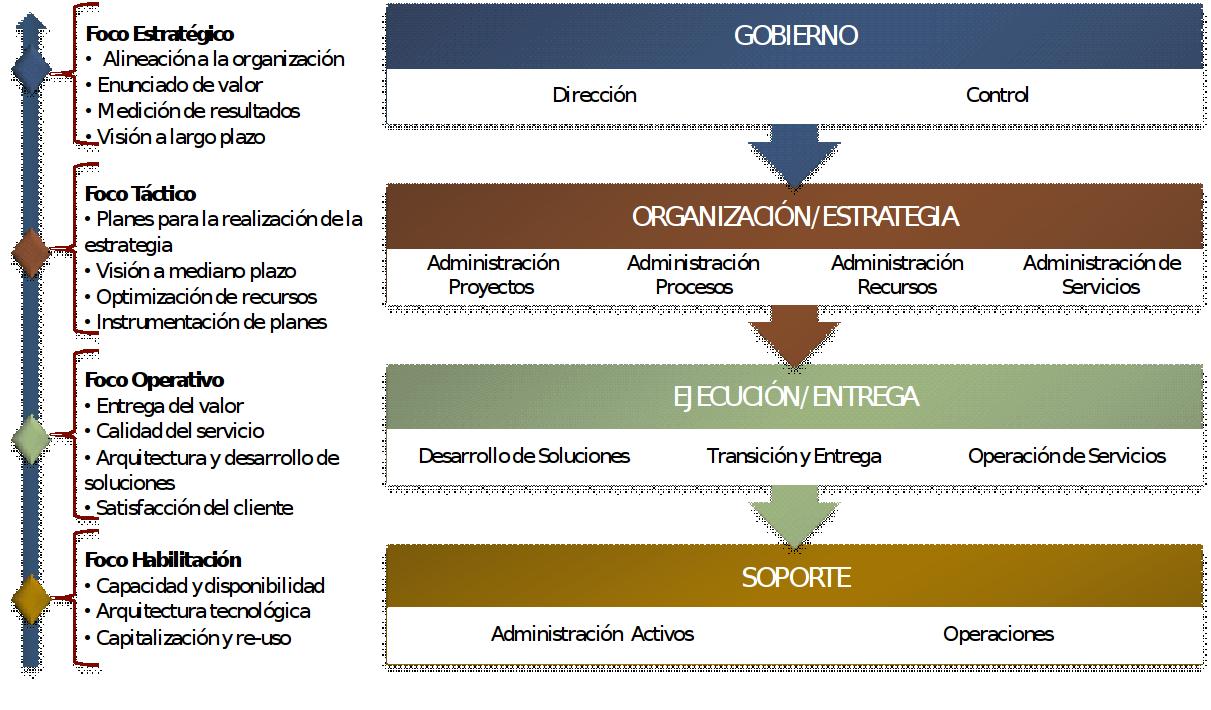 Los procesos del Marco rector se encuentran integrados en once grupos ubicados en cuatro niveles. La figura abajo, detalla los focos de atención de cada nivel, los cuáles cubren desde el nivel más estratégico hasta los habilitadores de la operación de soluciones y servicios.