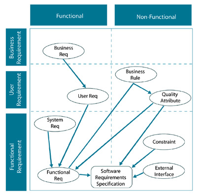 En la imagen se puede apreciar una estructura que inicia desde los requerimientos de negocio y termina en la especificación de requerimientos. Como se puede observar, las reglas del negocio son consideradas un aspecto no funcional y se clasifica como requerimiento de usuario.