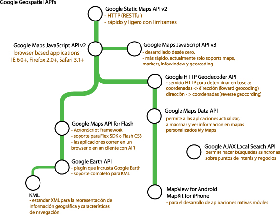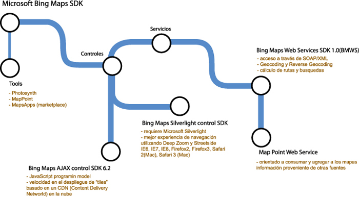 Centraremos este artículo en un par: Google Maps y Bing Maps, sin embargo cabe mencionar que existen muchos más jugadores o proveedores de plataformas para mapas tanto en modalidades de código abierto, como orientados a nichos específicos dependiendo el uso, pero por la relevancia del número de aplicaciones utilizando estas API´s Microsoft y Google están dictando el camino que seguirá en los próximos años este tipo de tecnología. Las figuras 1 y 2 muestran un panorama de los principales APIs provistos por Google y Bing.
