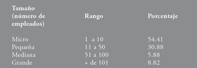 Al analizar el número promedio de empleados por tamaño de empresa, las microempresas presentan un promedio de 6 empleados, las pequeñas 23 y las medianas 76. Para el caso de las empresas grandes, se reflejó un sesgo introducido por la presencia en el estudio de una empresa de tamaño grande e intensiva en el número de personal (3,200 empleados), por lo que se estimó un valor medio corregido de empleados cuyo valor fue de 229 empleados.