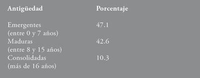 Tomando en cuenta el tiempo de permanencia en el mercado se identificaron tres bloques de antigüedad de empresas: emergentes, maduras y consolidadas (ver tabla 2).