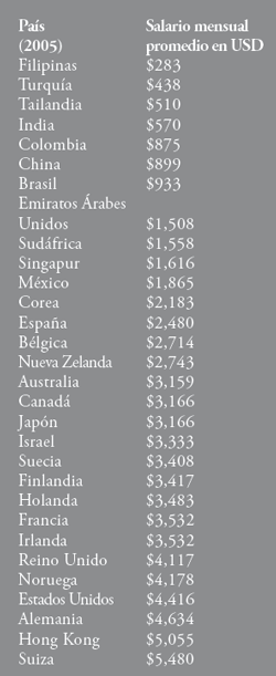 En la tabla 5 se muestran los salarios mensuales medios de un programador —en categoría: Software Engineer / Developer / Programmer— para varios países donde se puede observar una gran variación en los niveles de remuneración de esta actividad, desde un salario mensual medio de USD $283 en Filipinas, hasta un salario mensual medio de USD $5,480 en Suiza, y para el caso de México es de USD $1,865.